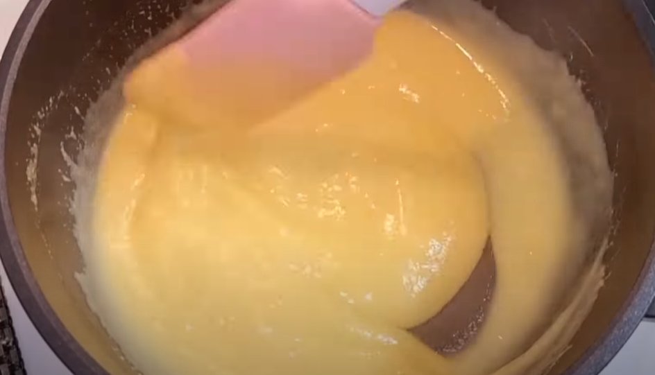 4. В сотейник разбейте яйца, добавьте сахар, муку и ванильный сахар. Венчиком разотрите до однородности. Влейте молоко. Поставьте на огонь и варите до загустения, постоянно помешивая.