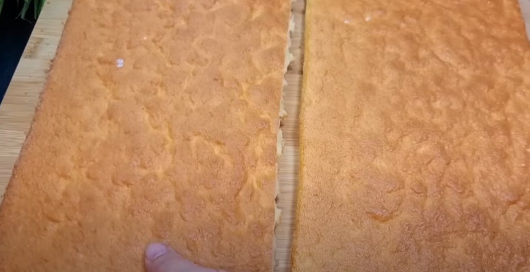 3. Вылейте тесто на противень, застеленный бумагой или ковриком. Выпекайте большой корж в течение 20 минут. В рецепте используется противень размером 40х35. Корж разрезается на 2 равные части (можно разрезать на 3 или на 4).