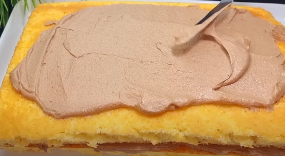 6. На первый корж выложить половину крема, сверху второй корж и на него вторую половину крема (если коржей больше, то разделить крем на 3 или 4 части соответственно). Обмажьте торт по бокам и сверху кремом, уберите в холодильник на 30 минут.